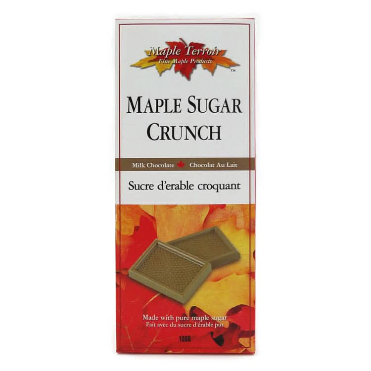 A delicious little crunch of pure maple sugar in every bite of this 100g milk chocolate bar!